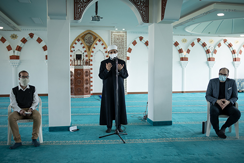 Imam Dr. Khaled Al-Seddiq, Pfarrer Eike Thies und Rabbiner-Student Josh Weiner während des Gebets im Gebetsraum des IZDB.Gebetsraum des IZDB.
